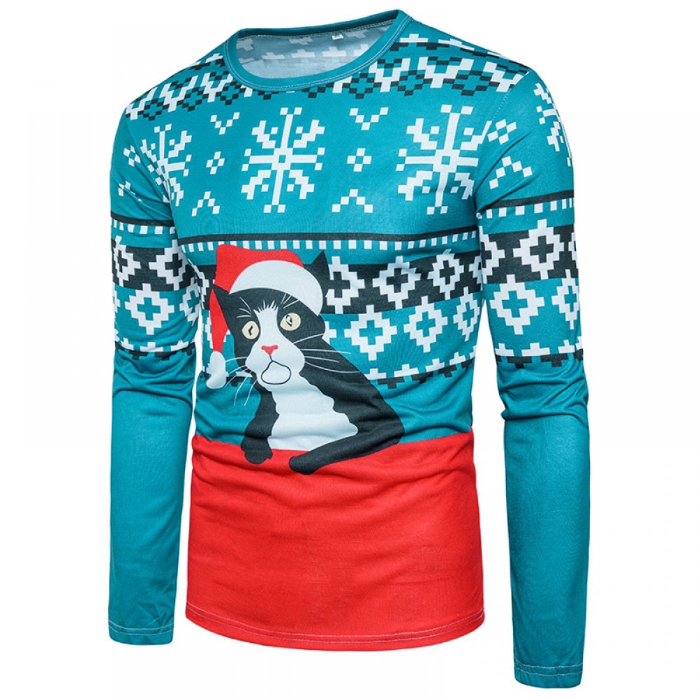 New 3D Personality Printing Fashion Men's Christmas Christmas Cat Dress Up Pattern Long-Sleeved T-Shirt